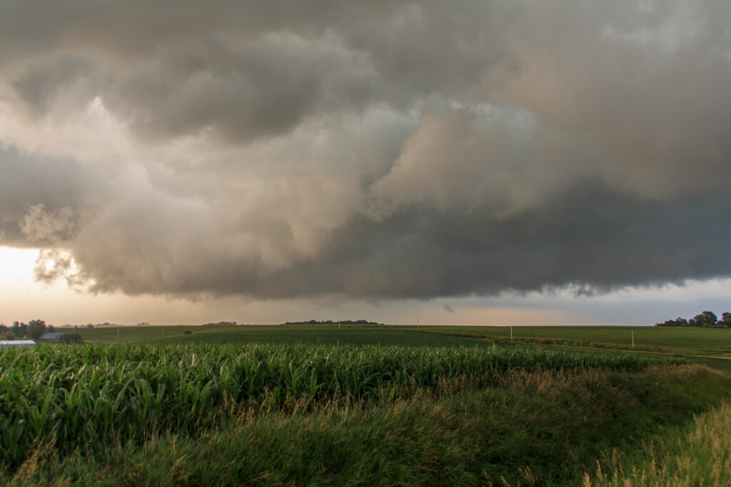 As we continued east on highway F58/296th Street, we eventually witnessed a very brief and small funnel which apparently touched down briefly. We continued east until US59 where the storm really started falling apart again. The traffic by this point was insane, with a huge line of cars coming down F58. We decided to bail north to Harlan and then east into the core to Kimballton before dropping back south in front of everyone again.