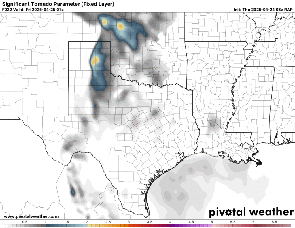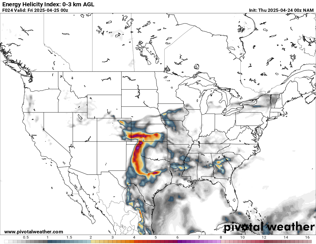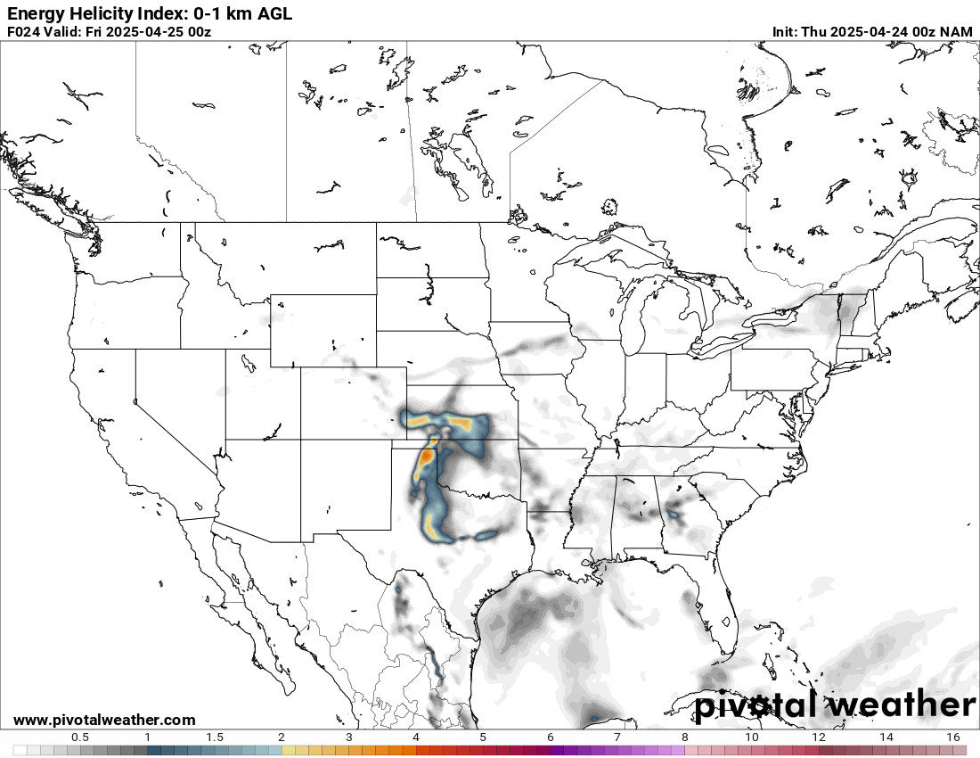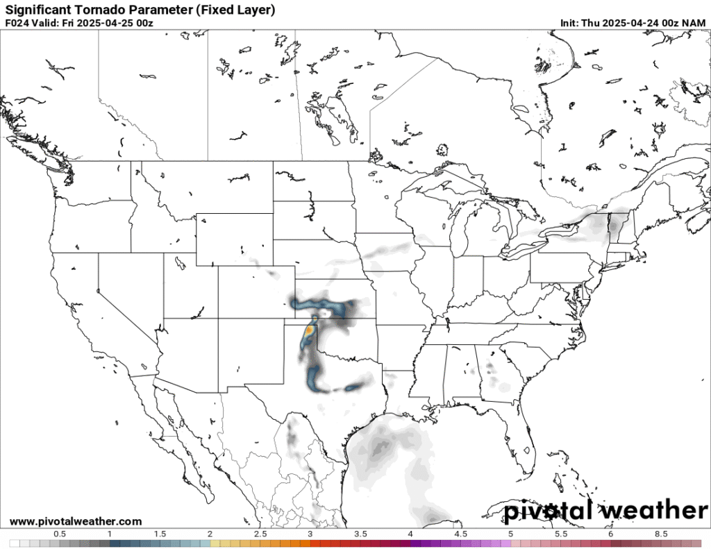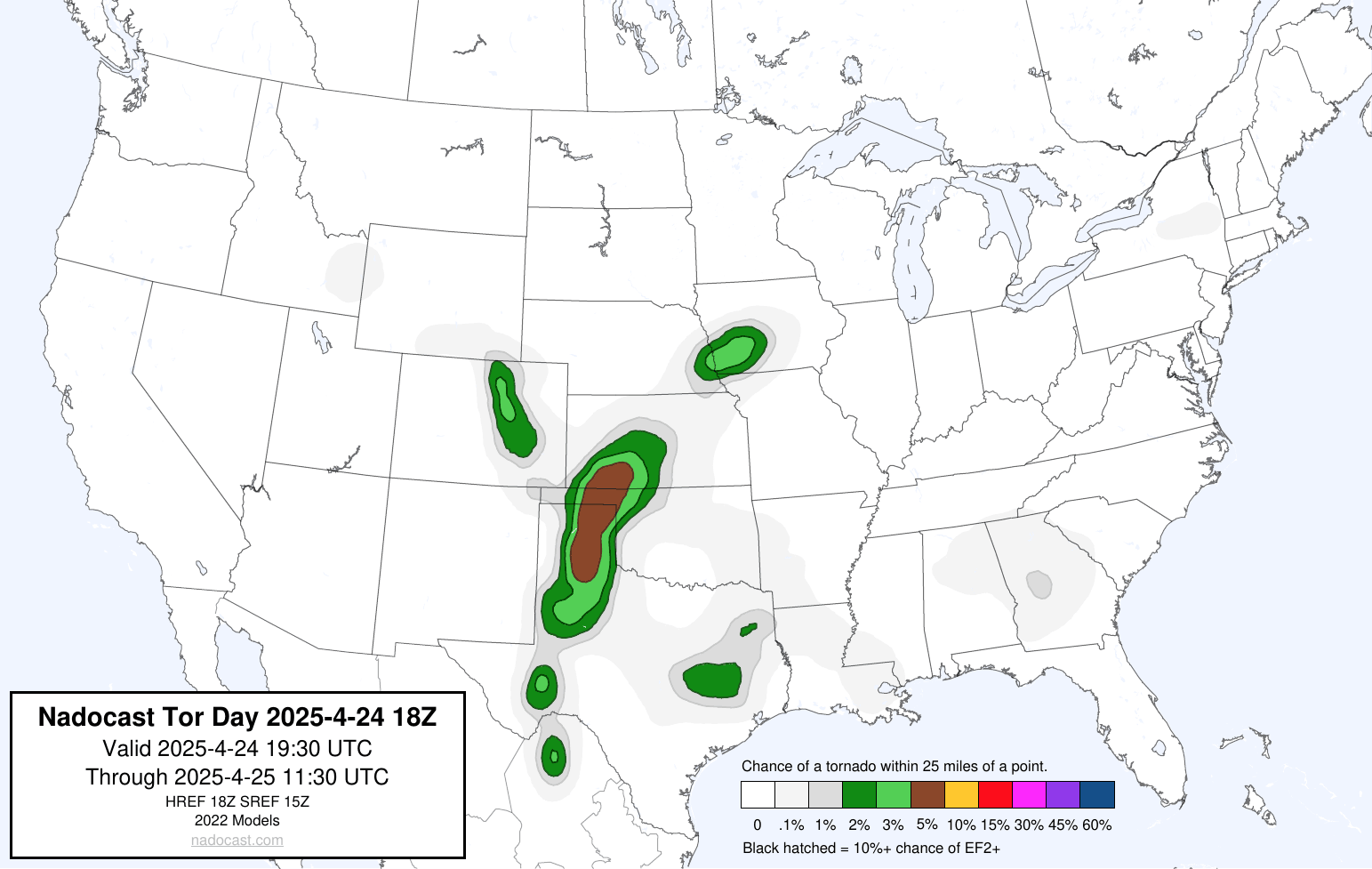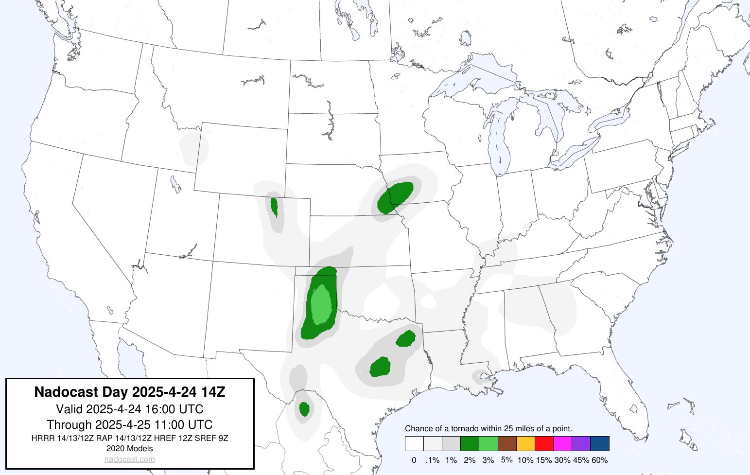 The nadocast was generally on the 24th, showing tornado potential throughout the Texas panhandle and even into Northwest Oklahoma. The later run also depicted potential all the way into Southwest Kansas.