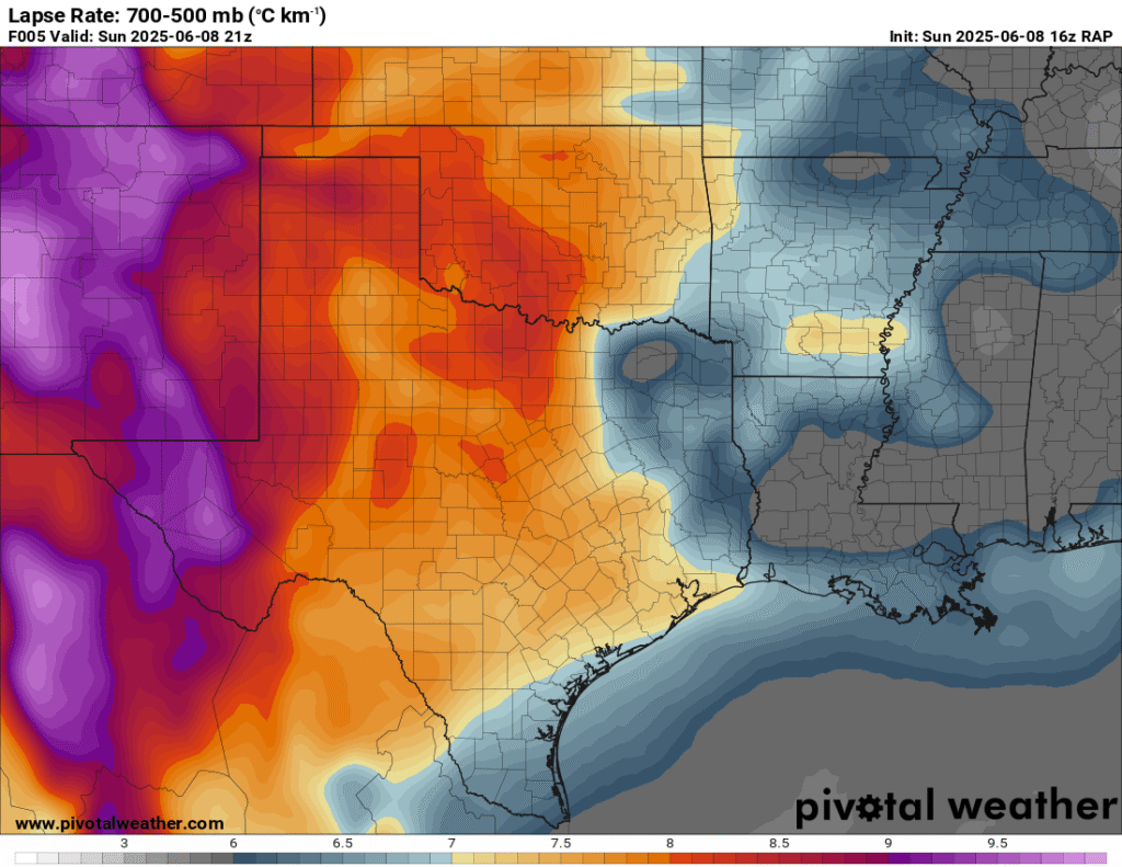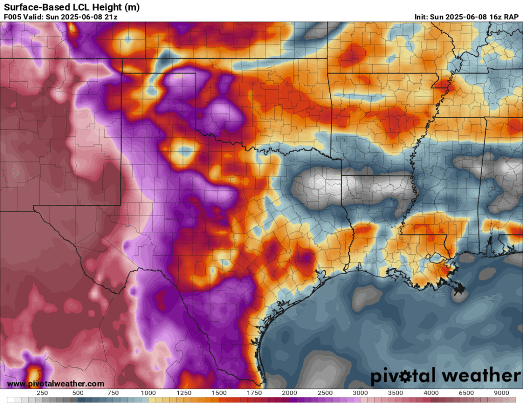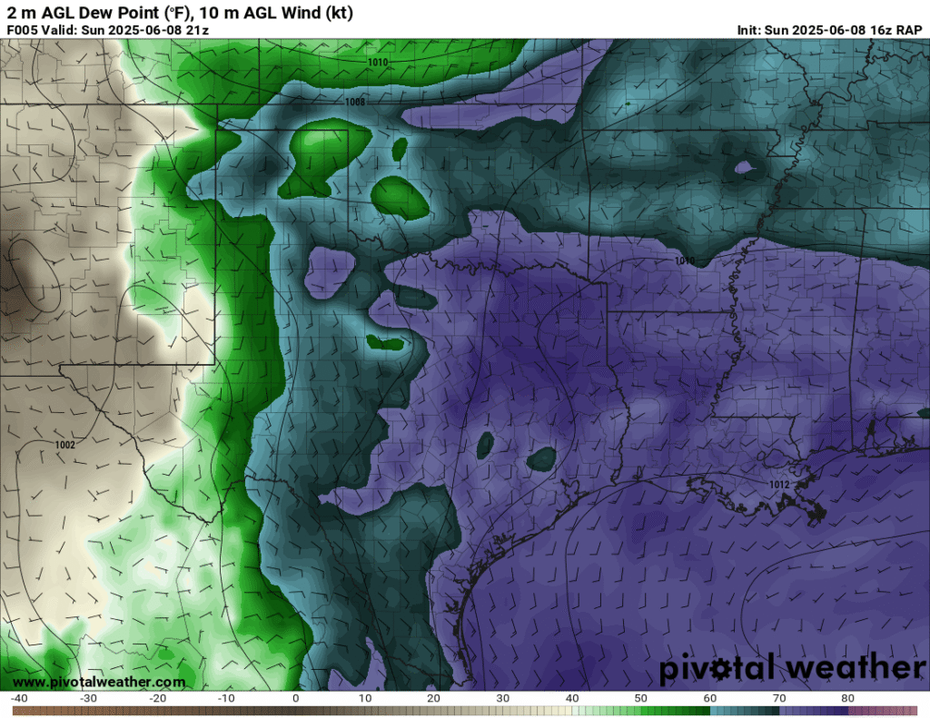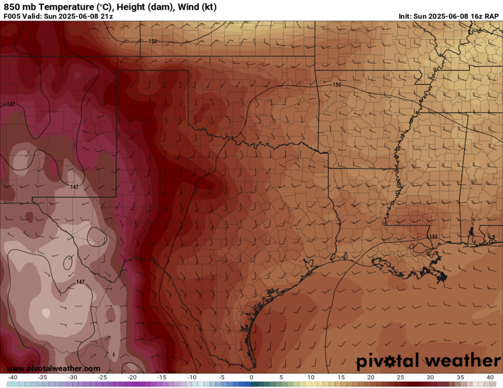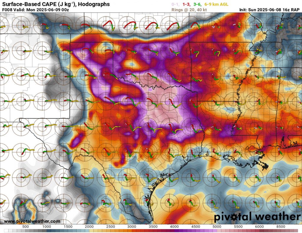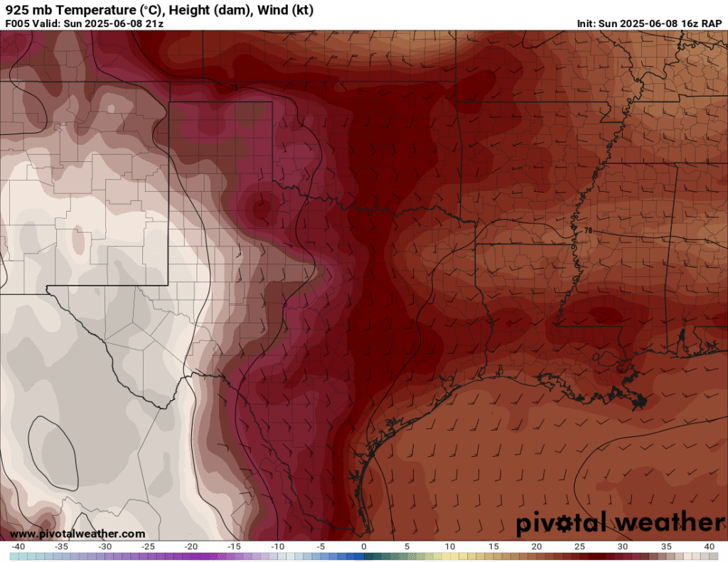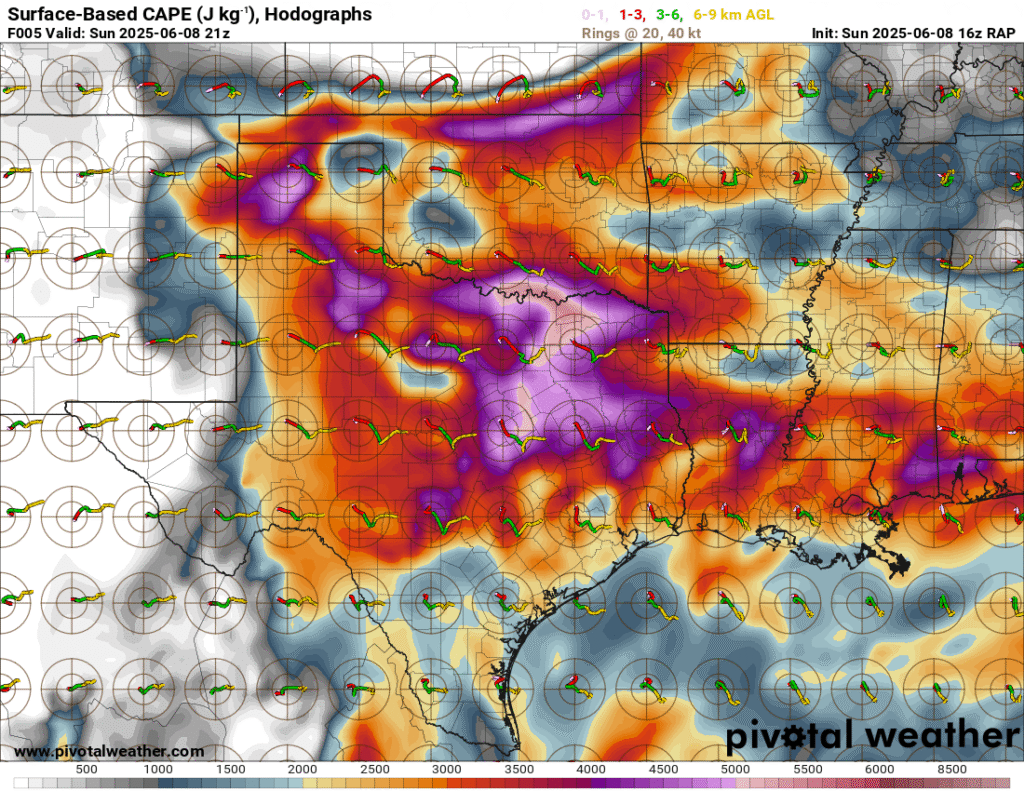 A very unstable atmosphere in place over the Texas panhandle with supercell shear. As it’s June, temperatures are a little high with RAP showing low 90 degree surface temps on the south side of the boundary with 70 degree dewpoints right up against the caprock.
