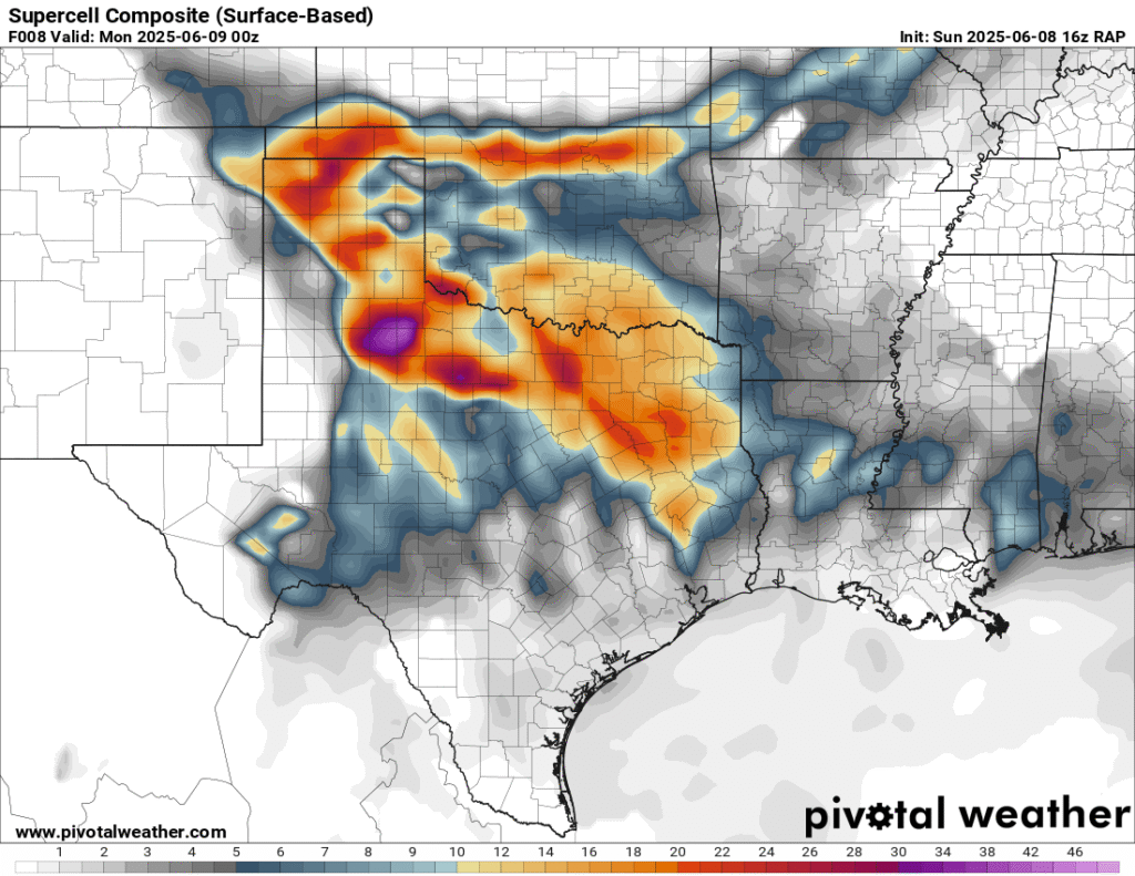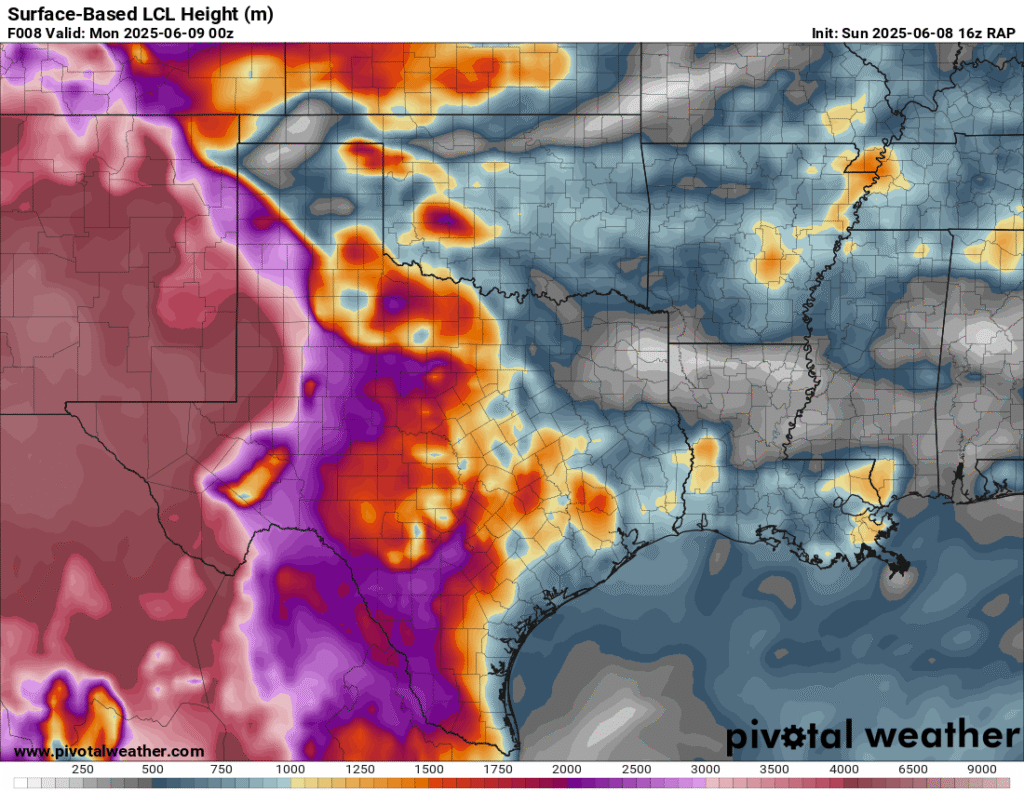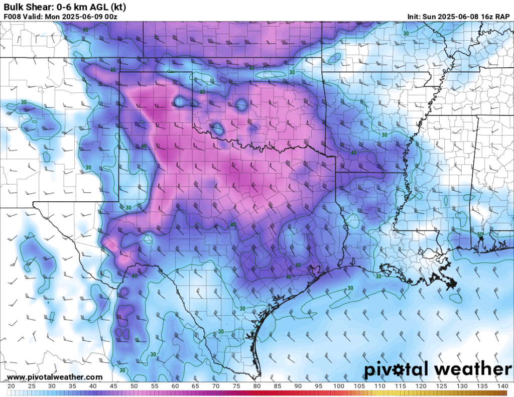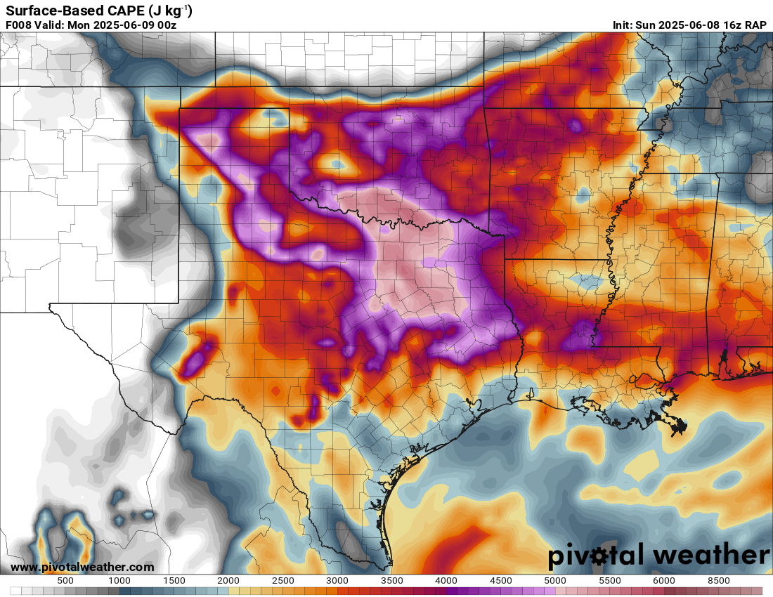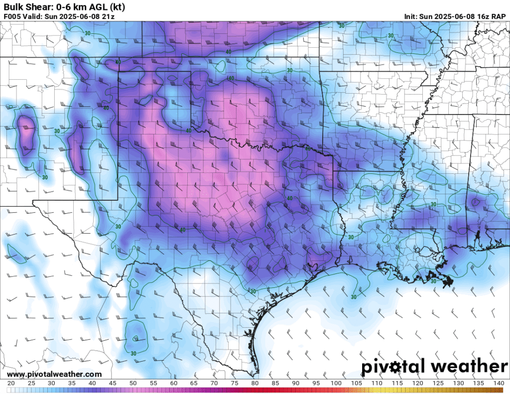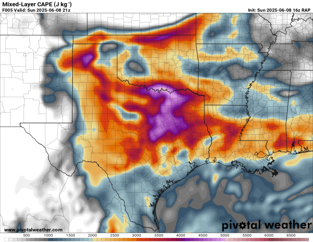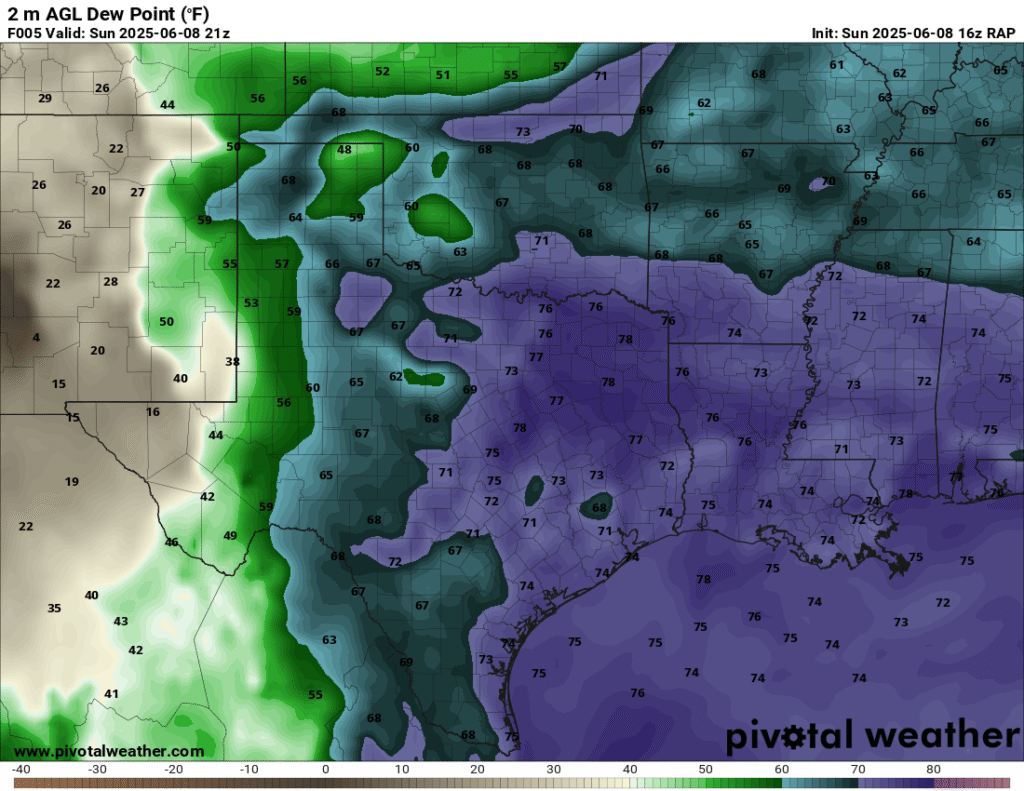 A very unstable atmosphere in place over the Texas panhandle with supercell shear. As it’s June, temperatures are a little high with RAP showing low 90 degree surface temps on the south side of the boundary with 70 degree dewpoints right up against the caprock.