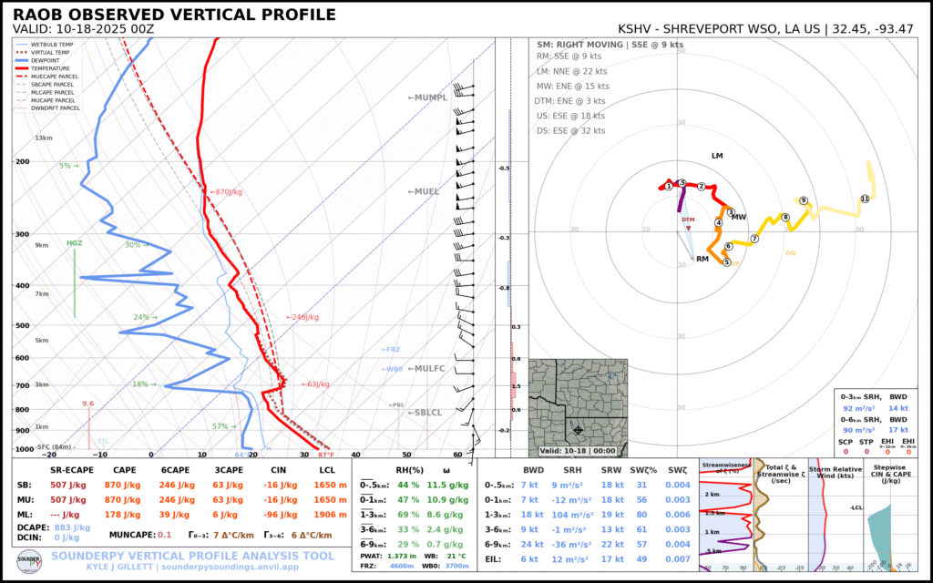 The 18z/1pm balloon came in from Shreveport and it was quite interesting with a long hodograph and good low level lapse rates. Unfortunately too many competing storms.