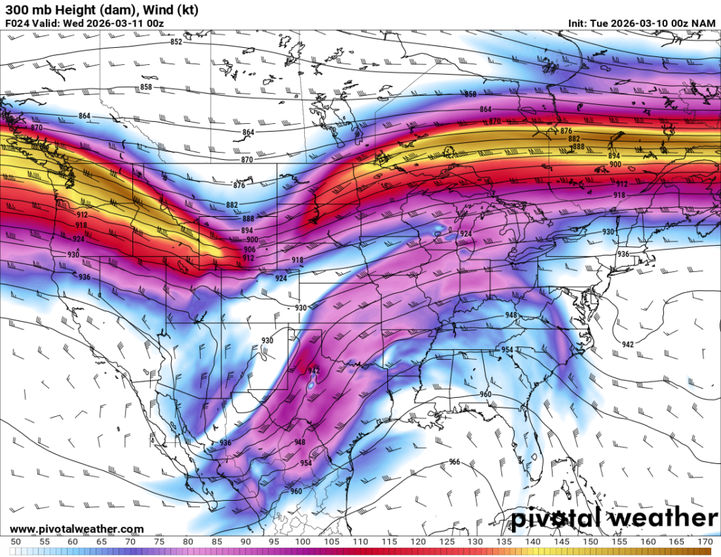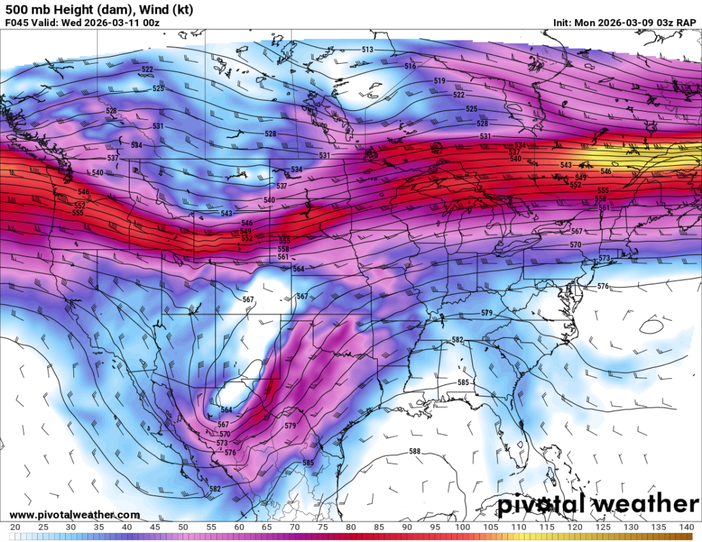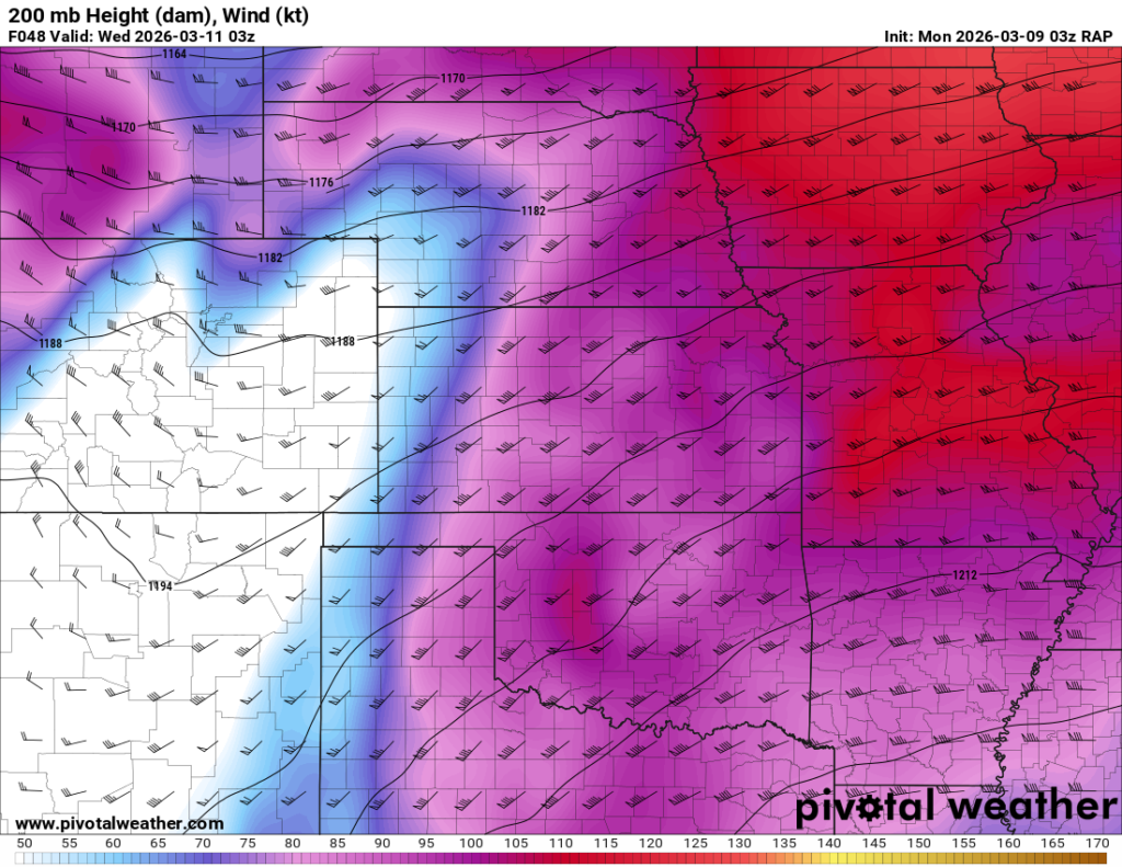 Looking out 2 full days, the evening RAP run on Saturday night March 7th (03Z on March 8) was showing the possibility of supercells in Central and Southern Oklahoma. With the main jet stream staying north, a cut off low over Northern Mexico and ejecting into Texas/Oklahoma in the late afternoon and evening hours. With the success I had with cutoff lows in 2012, I couldn’t ignore this system in the Southern Plains.